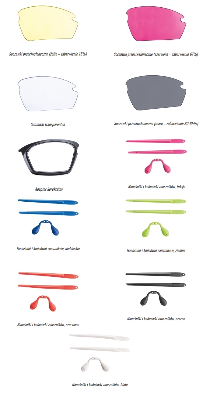 Regulowane nanośniki oraz końcówki zauszników są wymienne (dostępne oddzielnie). Wykonane są z miękkiej gumy, gwarantując wygodę użytkowania okularów.